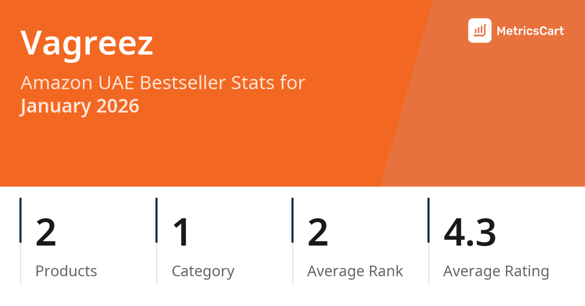 In January 2026, Vagreez appeared on Amazon UAE's bestseller lists with 2 unique products across 1 category. These products appeared in the category Fashion. The brand's products on the bestseller lists were priced between AED 20.99 and AED 25.00, with an average price of AED 22.03. These bestselling products maintained an average rating of 4.3 based on 2K total ratings from customers who purchased products that appeared on the bestseller lists.