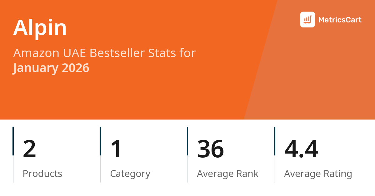 In January 2026, Alpin appeared on Amazon UAE's bestseller lists with 2 unique products across 1 category. These products appeared in the category Grocery. The brand's products on the bestseller lists were priced between AED 13.95 and AED 17.45, with an average price of AED 16.18. These bestselling products maintained an average rating of 4.4 based on 495 total ratings from customers who purchased products that appeared on the bestseller lists.