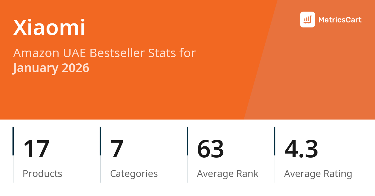In January 2026, Xiaomi appeared on Amazon UAE's bestseller lists with 17 unique products across 7 categories. These products appeared in categories including Electronics, Mobile Phones & Communication Products, and Kitchen. The brand's products on the bestseller lists were priced between AED 41.00 and AED 1,599.00, with an average price of AED 206.47. These bestselling products maintained an average rating of 4.3 based on 79K total ratings from customers who purchased products that appeared on the bestseller lists.