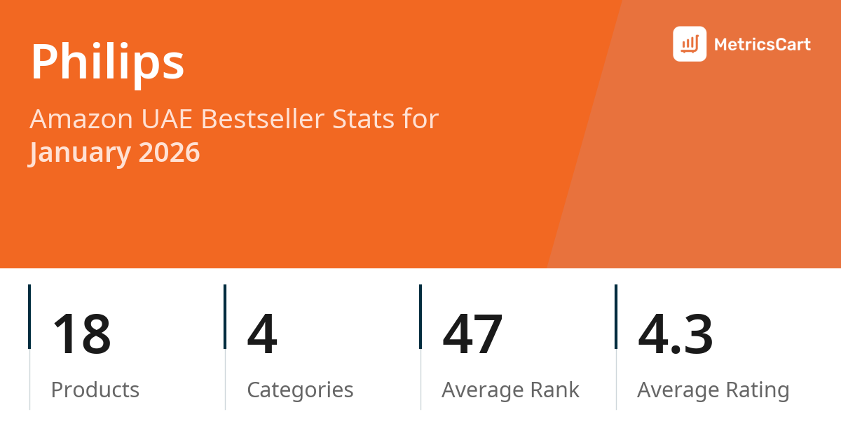 In January 2026, Philips appeared on Amazon UAE's bestseller lists with 18 unique products across 4 categories. These products appeared in categories including Kitchen, Tools & Home Improvement, and Electronics. The brand's products on the bestseller lists were priced between AED 48.95 and AED 478.00, with an average price of AED 140.65. These bestselling products maintained an average rating of 4.3 based on 69K total ratings from customers who purchased products that appeared on the bestseller lists.