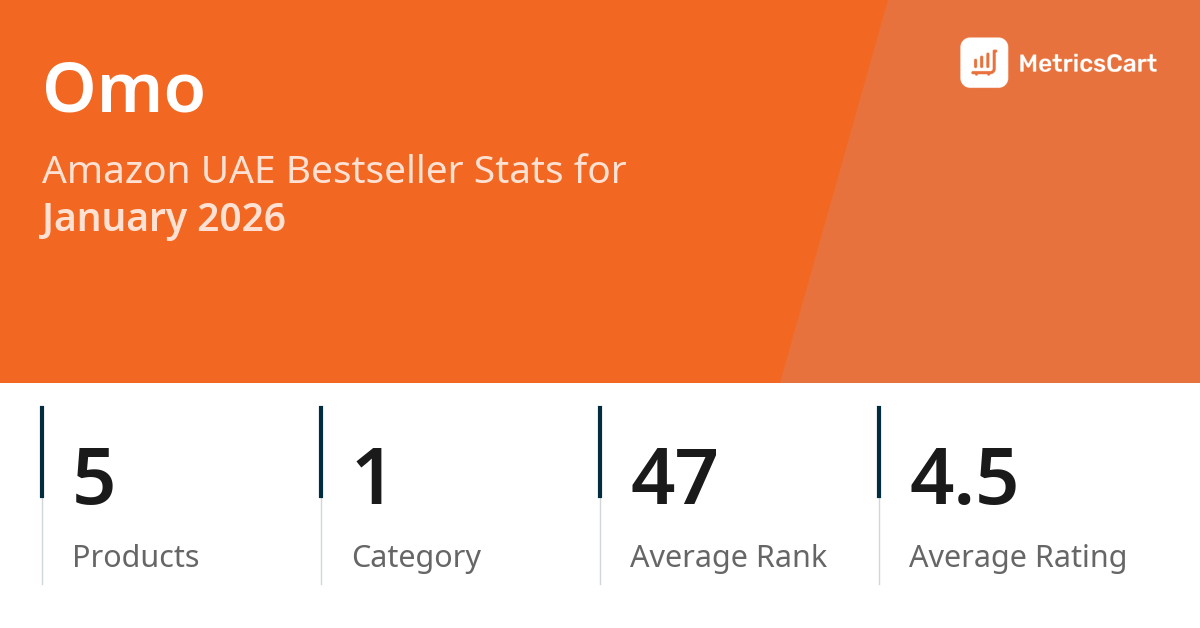 In January 2026, Omo appeared on Amazon UAE's bestseller lists with 5 unique products across 1 category. These products appeared in the category Health. The brand's products on the bestseller lists were priced between AED 22.60 and AED 67.80, with an average price of AED 41.68. These bestselling products maintained an average rating of 4.5 based on 5K total ratings from customers who purchased products that appeared on the bestseller lists.