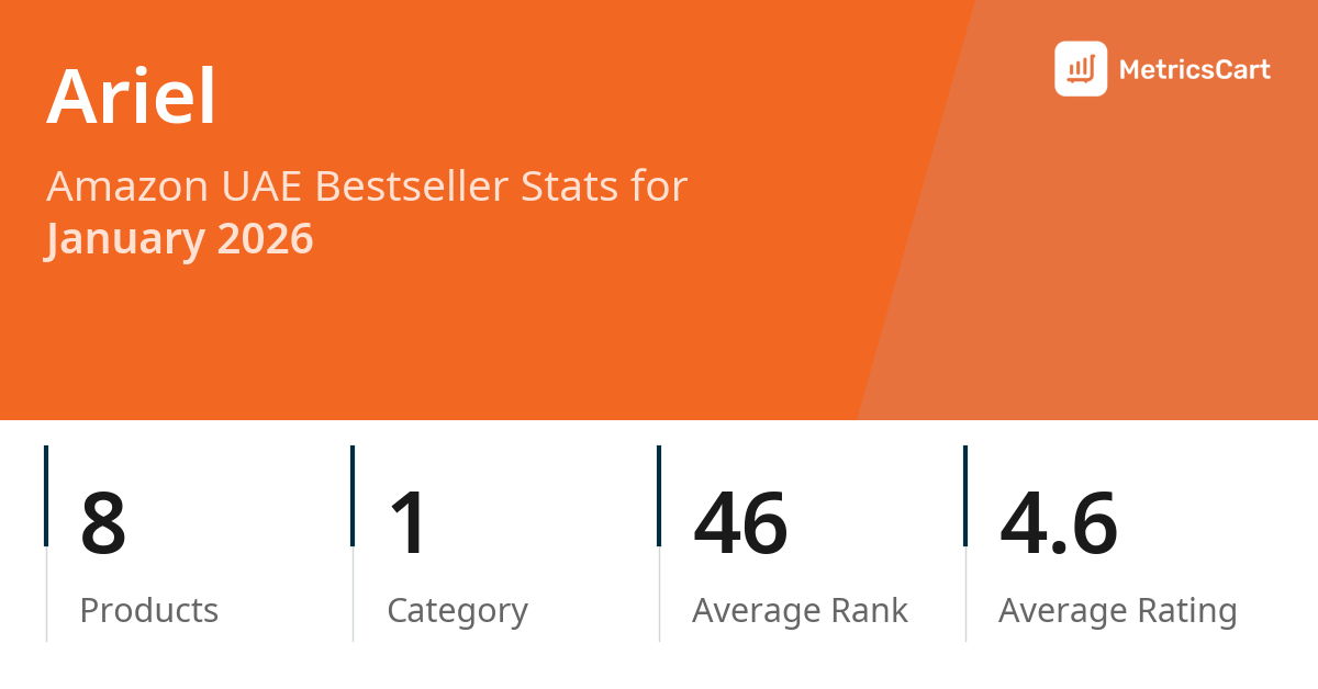 In January 2026, Ariel appeared on Amazon UAE's bestseller lists with 8 unique products across 1 category. These products appeared in the category Health. The brand's products on the bestseller lists were priced between AED 20.75 and AED 192.48, with an average price of AED 66.54. These bestselling products maintained an average rating of 4.6 based on 7K total ratings from customers who purchased products that appeared on the bestseller lists.