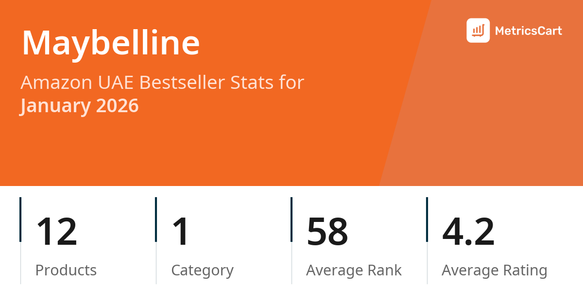 In January 2026, Maybelline appeared on Amazon UAE's bestseller lists with 12 unique products across 1 category. These products appeared in the category Beauty. The brand's products on the bestseller lists were priced between AED 8.25 and AED 44.00, with an average price of AED 24.57. These bestselling products maintained an average rating of 4.2 based on 225K total ratings from customers who purchased products that appeared on the bestseller lists.