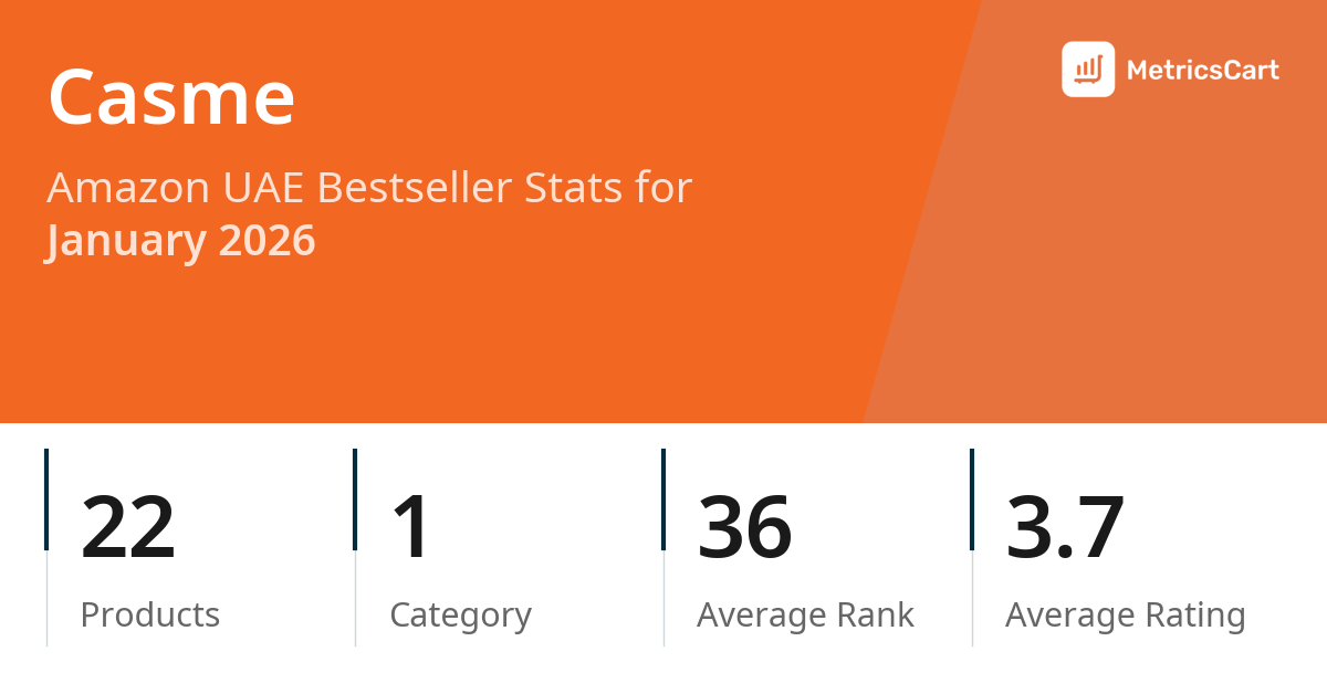 In January 2026, Casme appeared on Amazon UAE's bestseller lists with 22 unique products across 1 category. These products appeared in the category Fashion. The brand's products on the bestseller lists were priced between AED 27.87 and AED 48.99, with an average price of AED 38.58. These bestselling products maintained an average rating of 3.7 based on 353 total ratings from customers who purchased products that appeared on the bestseller lists.