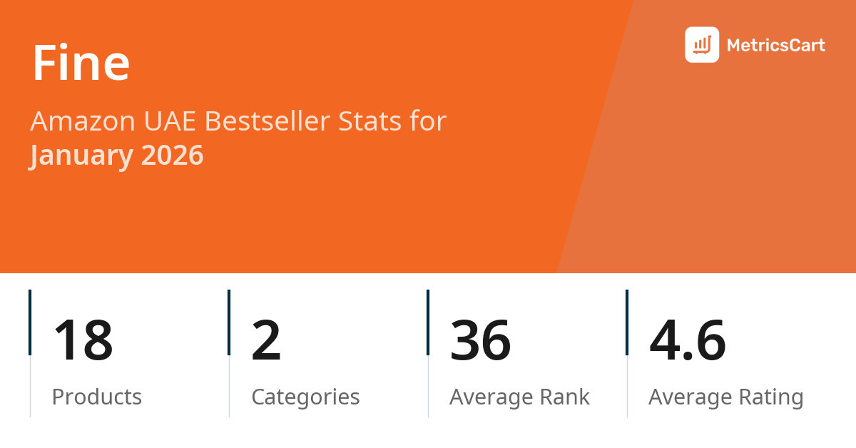 In January 2026, Fine appeared on Amazon UAE's bestseller lists with 18 unique products across 2 categories. These products appeared in categories including Health and Baby Products. The brand's products on the bestseller lists were priced between AED 8.00 and AED 38.90, with an average price of AED 21.08. These bestselling products maintained an average rating of 4.6 based on 17K total ratings from customers who purchased products that appeared on the bestseller lists.