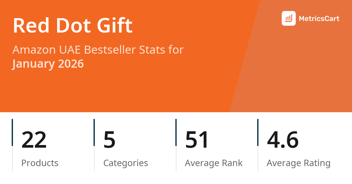 In January 2026, Red Dot Gift appeared on Amazon UAE's bestseller lists with 22 unique products across 5 categories. These products appeared in categories including Office Products, Baby Products, and Home. The brand's products on the bestseller lists were priced between AED 4.50 and AED 20.70, with an average price of AED 12.45. These bestselling products maintained an average rating of 4.6 based on 2K total ratings from customers who purchased products that appeared on the bestseller lists.