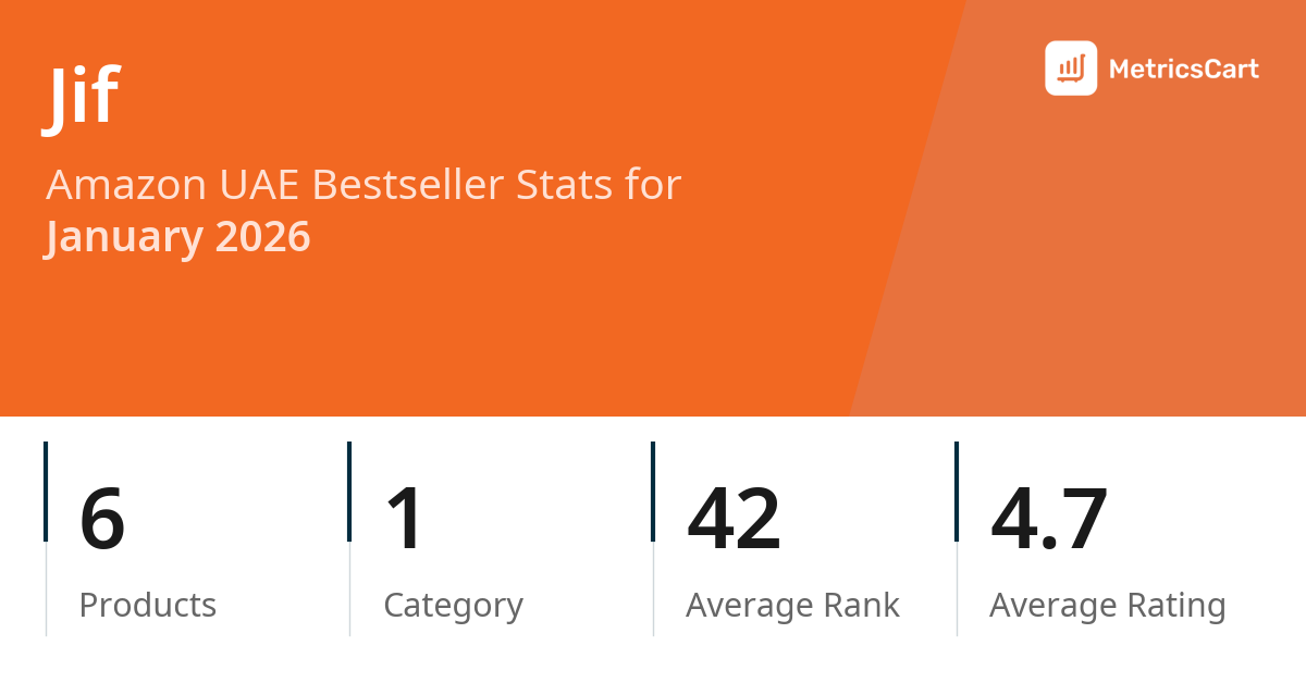 In January 2026, Jif appeared on Amazon UAE's bestseller lists with 6 unique products across 1 category. These products appeared in the category Health. The brand's products on the bestseller lists were priced between AED 7.69 and AED 38.00, with an average price of AED 20.31. These bestselling products maintained an average rating of 4.7 based on 7K total ratings from customers who purchased products that appeared on the bestseller lists.