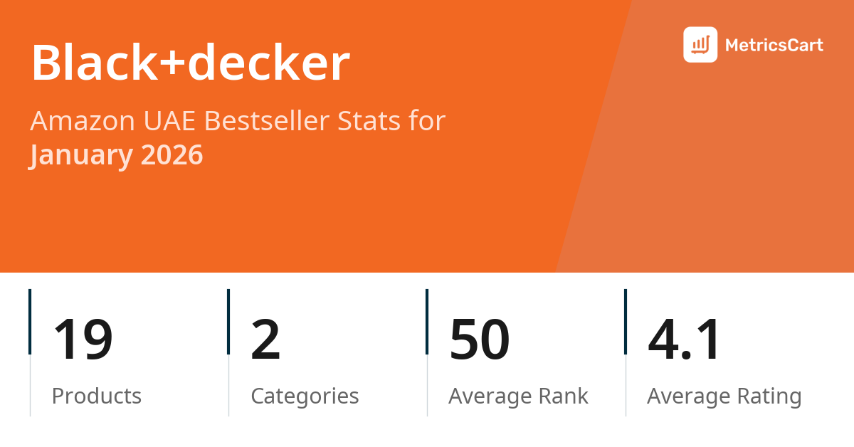 In January 2026, Black+decker appeared on Amazon UAE's bestseller lists with 19 unique products across 2 categories. These products appeared in categories including Kitchen and Tools & Home Improvement. The brand's products on the bestseller lists were priced between AED 11.25 and AED 298.99, with an average price of AED 112.63. These bestselling products maintained an average rating of 4.1 based on 60K total ratings from customers who purchased products that appeared on the bestseller lists.