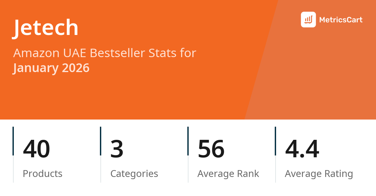 In January 2026, Jetech appeared on Amazon UAE's bestseller lists with 40 unique products across 3 categories. These products appeared in categories including Mobile Phones & Communication Products, Computers, and Electronics. The brand's products on the bestseller lists were priced between AED 25.48 and AED 58.64, with an average price of AED 37.05. These bestselling products maintained an average rating of 4.4 based on 1.5M total ratings from customers who purchased products that appeared on the bestseller lists.