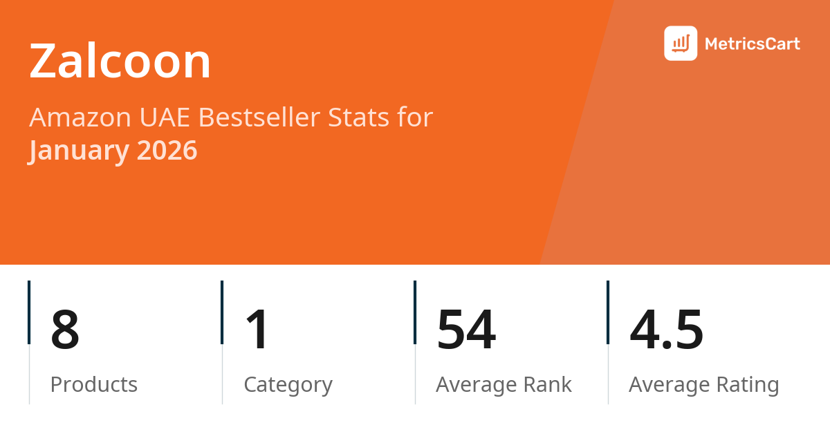 In January 2026, Zalcoon appeared on Amazon UAE's bestseller lists with 8 unique products across 1 category. These products appeared in the category Home. The brand's products on the bestseller lists were priced between AED 18.95 and AED 59.95, with an average price of AED 40.72. These bestselling products maintained an average rating of 4.5 based on 1K total ratings from customers who purchased products that appeared on the bestseller lists.