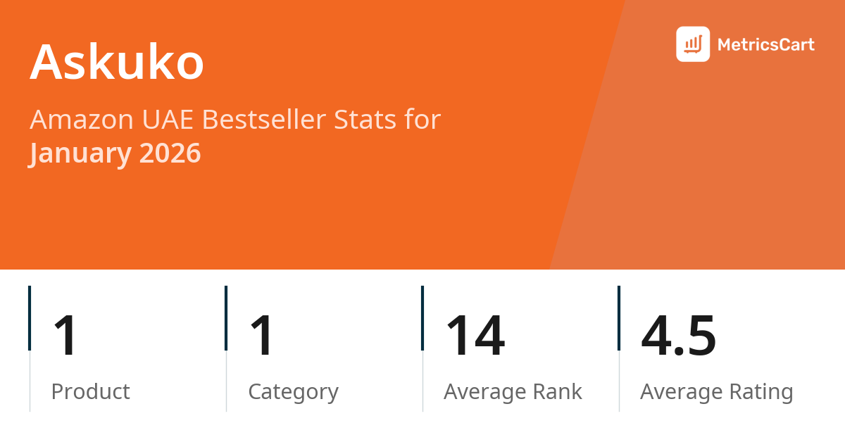 In January 2026, Askuko appeared on Amazon UAE's bestseller lists with 1 unique product across 1 category. These products appeared in the category Computers. The brand's products on the bestseller lists were priced between AED 14.53 and AED 24.00, with an average price of AED 20.04. These bestselling products maintained an average rating of 4.5 based on 2K total ratings from customers who purchased products that appeared on the bestseller lists.