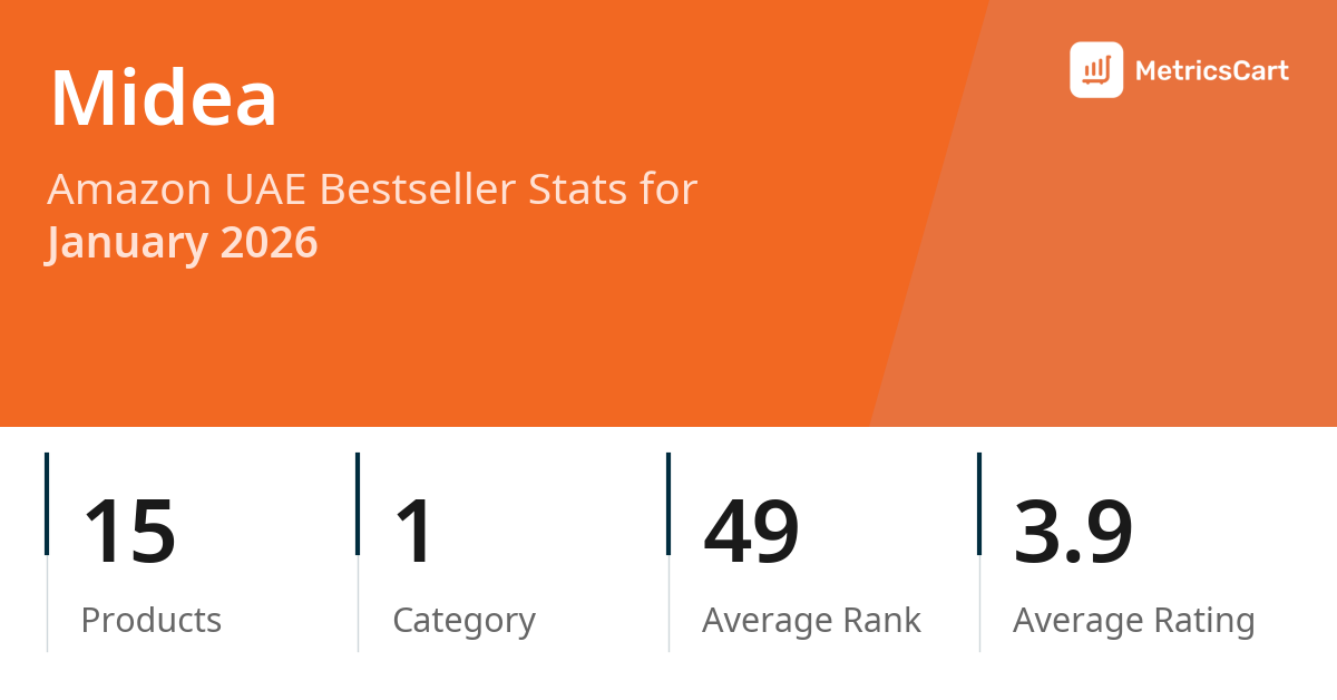 In January 2026, Midea appeared on Amazon UAE's bestseller lists with 15 unique products across 1 category. These products appeared in the category Appliances. The brand's products on the bestseller lists were priced between AED 572.00 and AED 1,965.15, with an average price of AED 934.40. These bestselling products maintained an average rating of 3.9 based on 2K total ratings from customers who purchased products that appeared on the bestseller lists.
