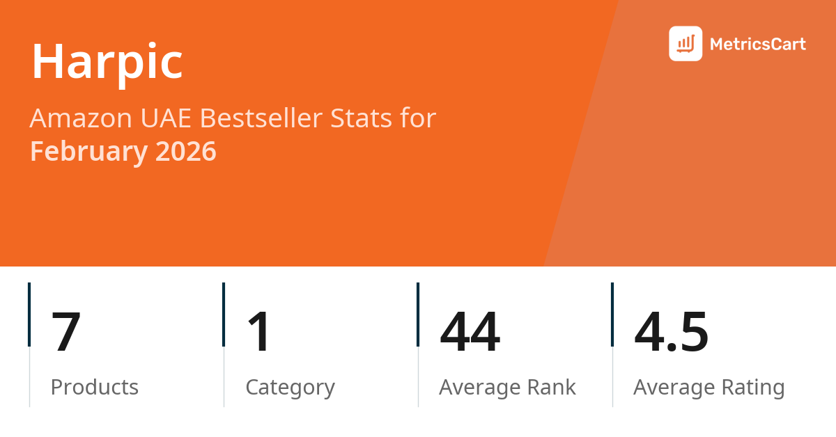 In February 2026, Harpic appeared on Amazon UAE's bestseller lists with 7 unique products across 1 category. These products appeared in the category Health. The brand's products on the bestseller lists were priced between AED 10.50 and AED 22.75, with an average price of AED 18.17. These bestselling products maintained an average rating of 4.5 based on 7K total ratings from customers who purchased products that appeared on the bestseller lists.