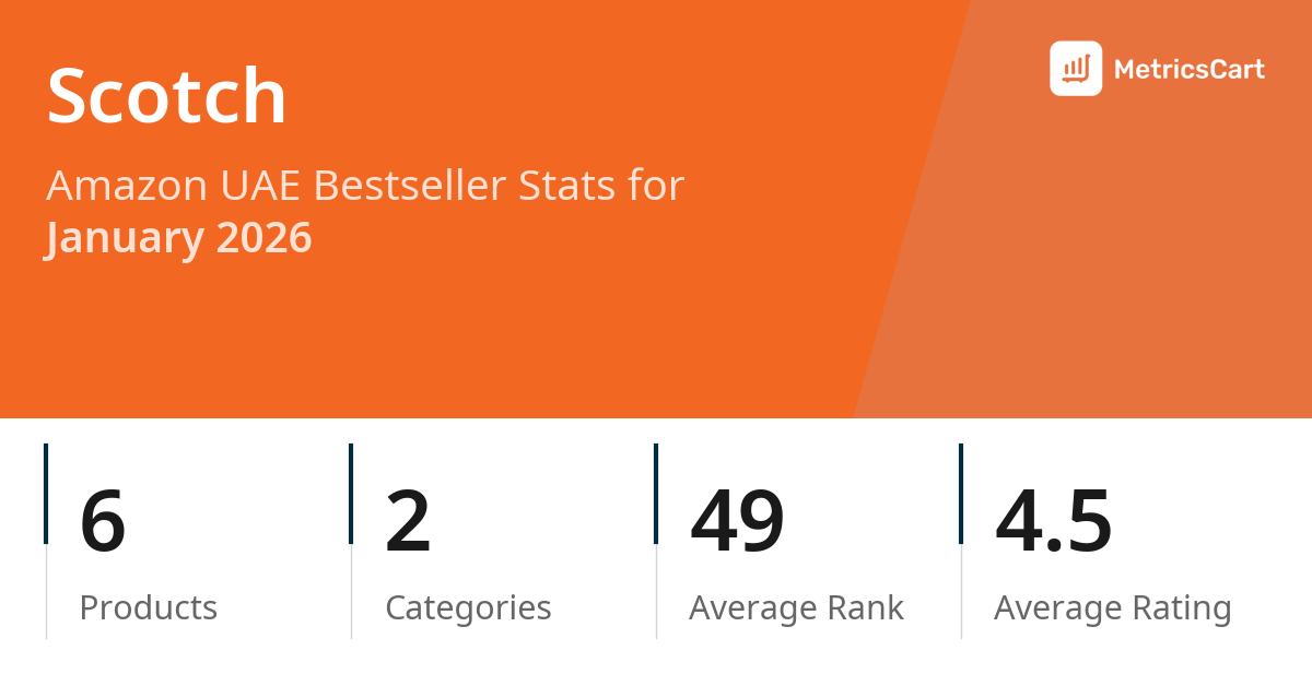 In January 2026, Scotch appeared on Amazon UAE's bestseller lists with 6 unique products across 2 categories. These products appeared in categories including Office Products and Tools & Home Improvement. The brand's products on the bestseller lists were priced between AED 4.60 and AED 19.00, with an average price of AED 12.17. These bestselling products maintained an average rating of 4.5 based on 7K total ratings from customers who purchased products that appeared on the bestseller lists.