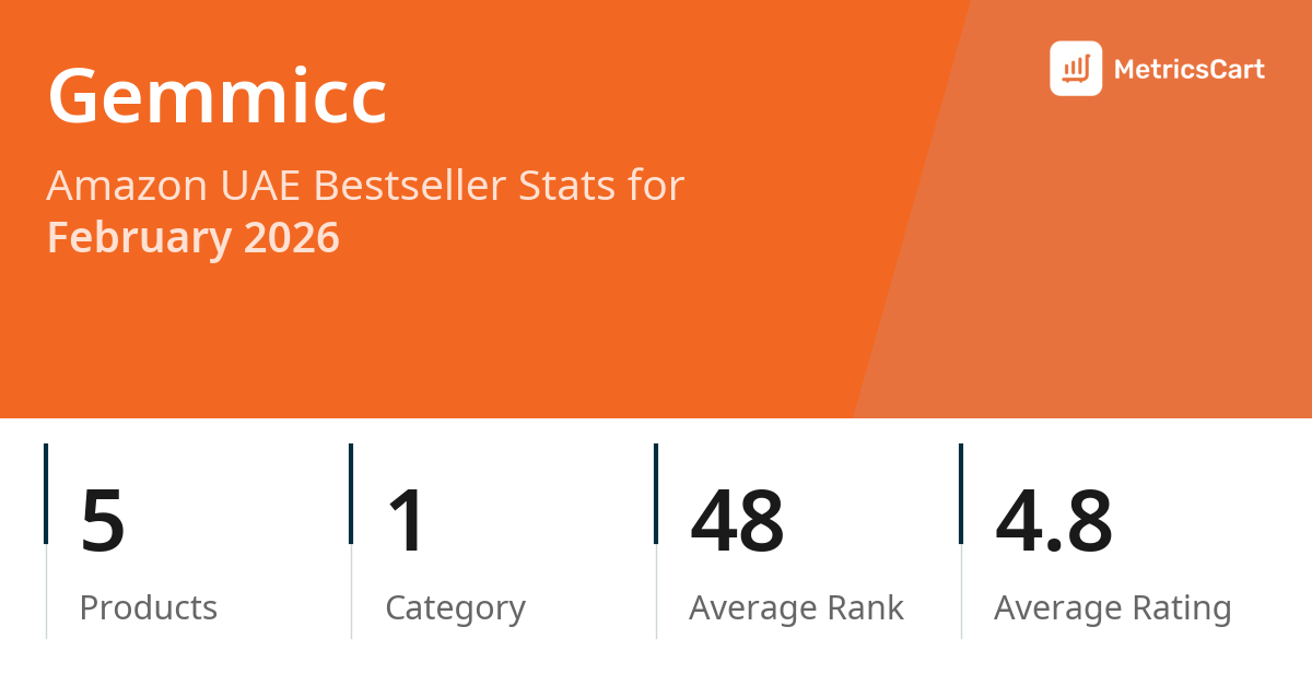 In February 2026, Gemmicc appeared on Amazon UAE's bestseller lists with 5 unique products across 1 category. These products appeared in the category Toys. The brand's products on the bestseller lists were priced between AED 39.99 and AED 139.99, with an average price of AED 99.26. These bestselling products maintained an average rating of 4.8 based on 13K total ratings from customers who purchased products that appeared on the bestseller lists.