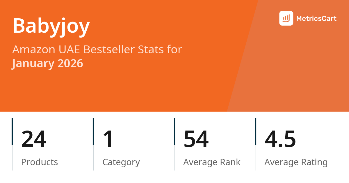 In January 2026, Babyjoy appeared on Amazon UAE's bestseller lists with 24 unique products across 1 category. These products appeared in the category Baby Products. The brand's products on the bestseller lists were priced between AED 20.00 and AED 168.35, with an average price of AED 68.25. These bestselling products maintained an average rating of 4.5 based on 16K total ratings from customers who purchased products that appeared on the bestseller lists.