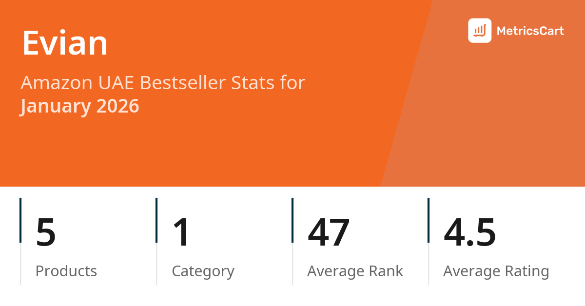 In January 2026, Evian appeared on Amazon UAE's bestseller lists with 5 unique products across 1 category. These products appeared in the category Grocery. The brand's products on the bestseller lists were priced between AED 32.50 and AED 95.00, with an average price of AED 72.37. These bestselling products maintained an average rating of 4.5 based on 4K total ratings from customers who purchased products that appeared on the bestseller lists.