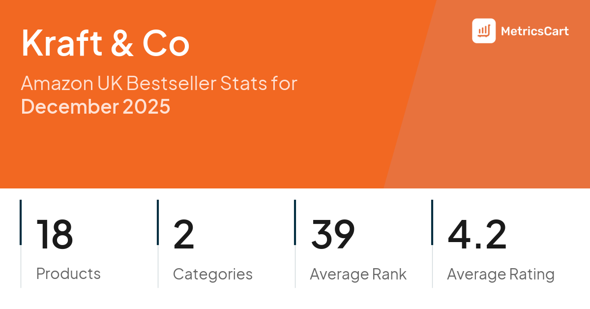 In December 2025, Kraft & Co appeared on Amazon UK's bestseller lists with 18 unique products across 2 categories. These products appeared in categories including Stationery & Office Supplies and Home & Kitchen. The brand's products on the bestseller lists were priced between £4.49 and £14.99, with an average price of £9.98. These bestselling products maintained an average rating of 4.2 based on 10K total ratings from customers who purchased products that appeared on the bestseller lists.