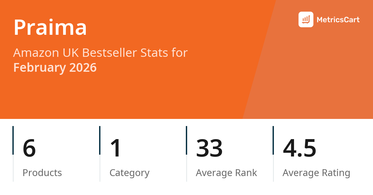 In February 2026, Praima appeared on Amazon UK's bestseller lists with 6 unique products across 1 category. These products appeared in the category DIY & Tools. The brand's products on the bestseller lists were priced between £3.99 and £5.99, with an average price of £5.42. These bestselling products maintained an average rating of 4.5 based on 30K total ratings from customers who purchased products that appeared on the bestseller lists.