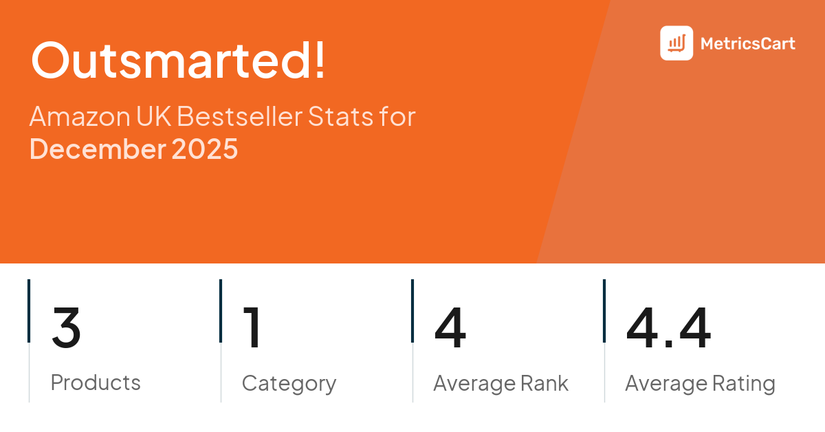 In December 2025, Outsmarted! appeared on Amazon UK's bestseller lists with 3 unique products across 1 category. These products appeared in the category Toys & Games. The brand's products on the bestseller lists were priced between £19.98 and £34.99, with an average price of £24.27. These bestselling products maintained an average rating of 4.4 based on 27K total ratings from customers who purchased products that appeared on the bestseller lists.