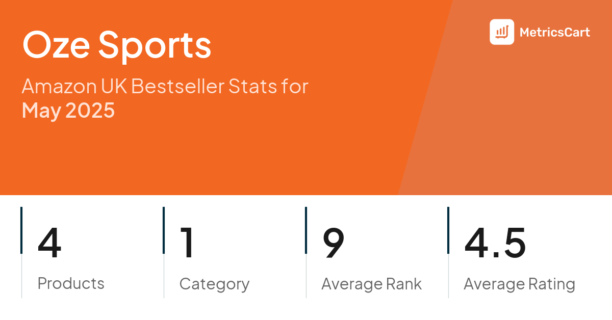 In May 2025, Oze Sports appeared on Amazon UK's bestseller lists with 4 unique products across 1 category. These products appeared in the category Sports & Outdoors. The brand's products on the bestseller lists were priced between £9.99 and £12.99, with an average price of £11.45. These bestselling products maintained an average rating of 4.5 based on 18K total ratings from customers who purchased products that appeared on the bestseller lists.