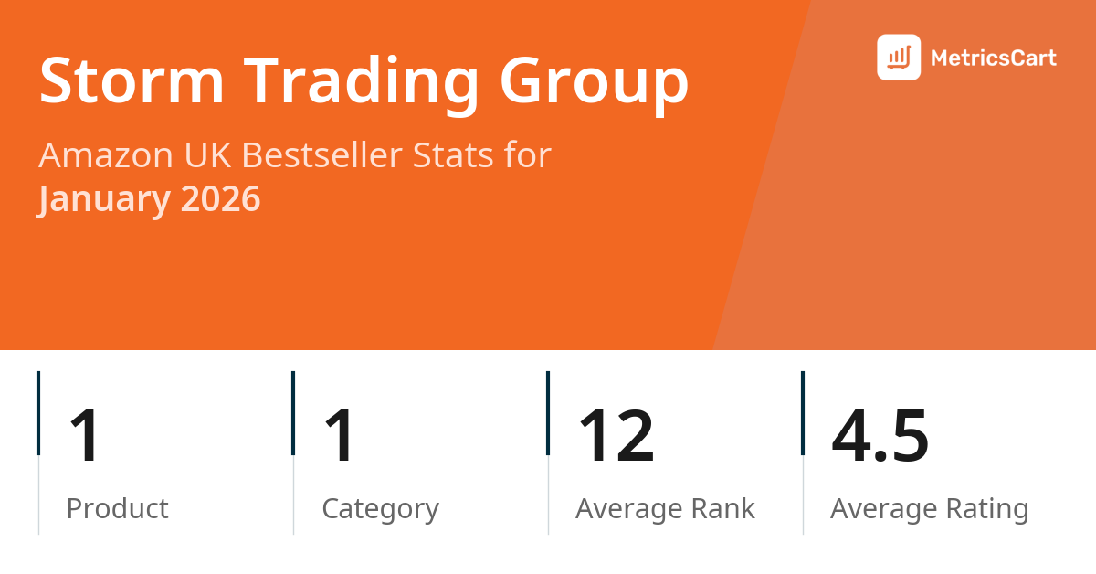 In January 2026, Storm Trading Group appeared on Amazon UK's bestseller lists with 1 unique product across 1 category. These products appeared in the category Stationery & Office Supplies. The brand's products on the bestseller lists had an average price of £11.99. These bestselling products maintained an average rating of 4.5 based on 19K total ratings from customers who purchased products that appeared on the bestseller lists.