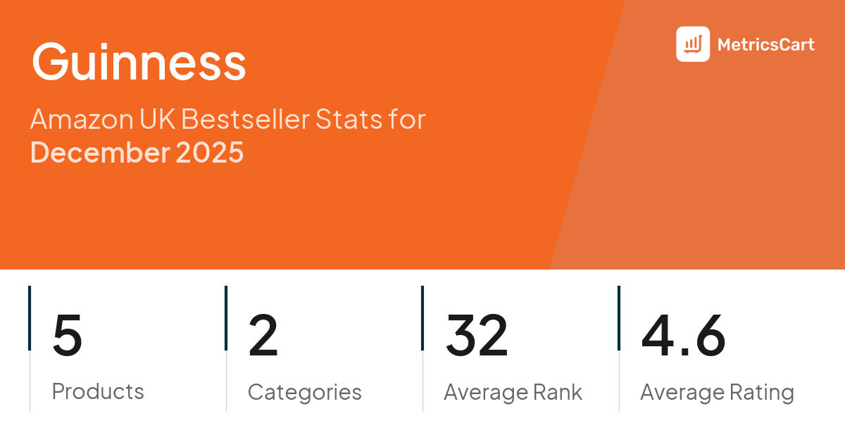 In December 2025, Guinness appeared on Amazon UK's bestseller lists with 5 unique products across 2 categories. These products appeared in categories including Home & Kitchen and Grocery. The brand's products on the bestseller lists were priced between £7.00 and £25.00, with an average price of £16.94. These bestselling products maintained an average rating of 4.6 based on 11K total ratings from customers who purchased products that appeared on the bestseller lists.