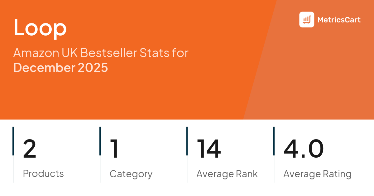 In December 2025, Loop appeared on Amazon UK's bestseller lists with 2 unique products across 1 category. These products appeared in the category Health & Personal Care. The brand's products on the bestseller lists were priced between £13.95 and £19.95, with an average price of £16.96. These bestselling products maintained an average rating of 4.0 based on 40K total ratings from customers who purchased products that appeared on the bestseller lists.