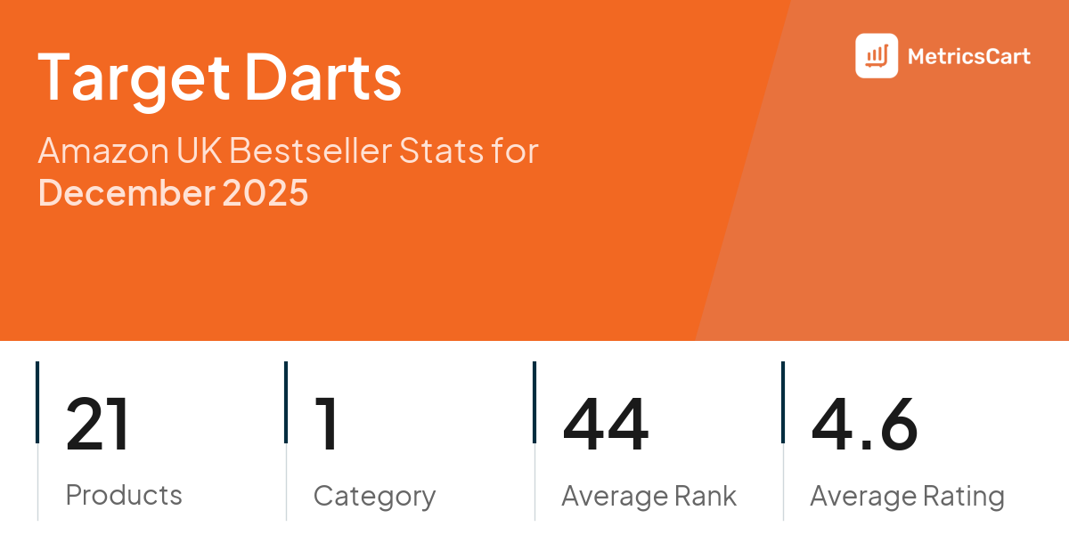 In December 2025, Target Darts appeared on Amazon UK's bestseller lists with 21 unique products across 1 category. These products appeared in the category Sports & Outdoors. The brand's products on the bestseller lists were priced between £5.85 and £61.95, with an average price of £15.38. These bestselling products maintained an average rating of 4.6 based on 58K total ratings from customers who purchased products that appeared on the bestseller lists.