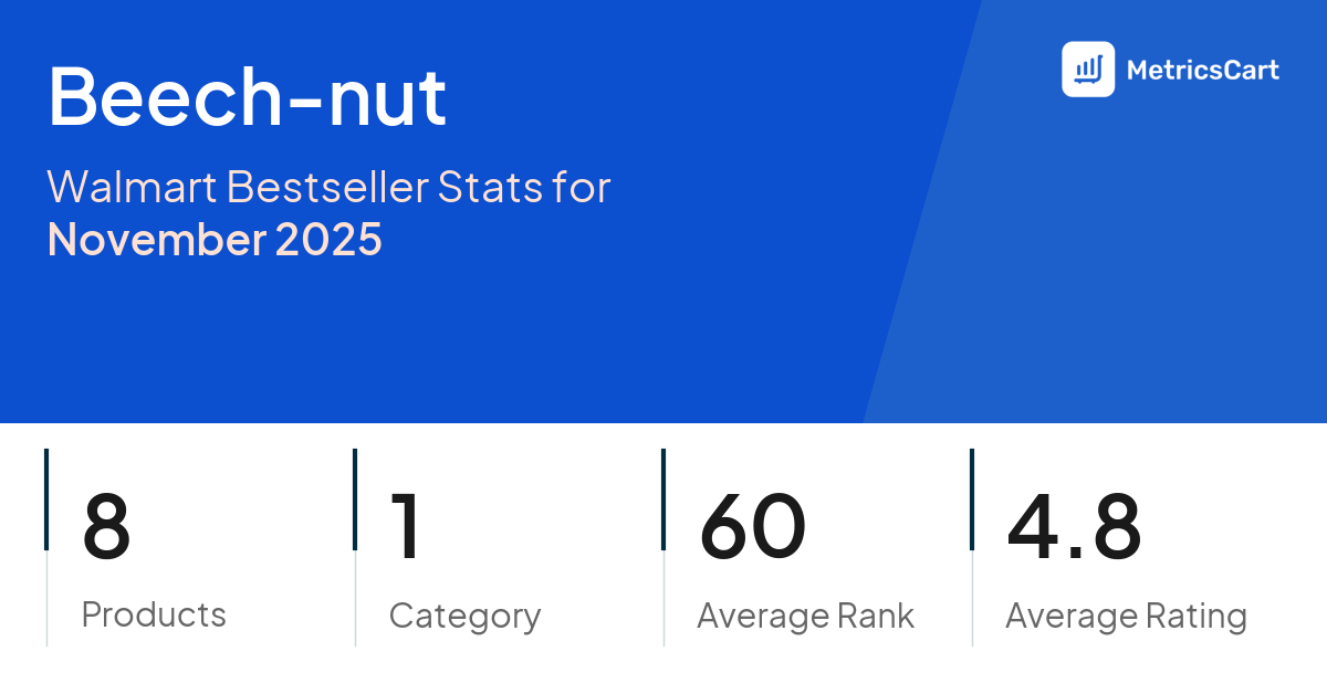 In November 2025, Beech-nut appeared on Walmart's bestseller lists with 8 unique products across 1 category. These products appeared in the category Baby. The brand's products on the bestseller lists were priced between $1.26 and $11.80, with an average price of $4.64. These bestselling products maintained an average rating of 4.8 based on 4K total ratings from customers who purchased products that appeared on the bestseller lists.