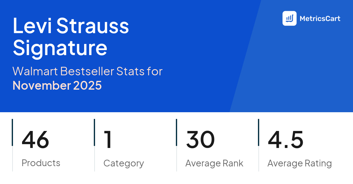 In November 2025, Levi Strauss Signature appeared on Walmart's bestseller lists with 46 unique products across 1 category. These products appeared in the category Fashion. The brand's products on the bestseller lists were priced between $13.28 and $27.89, with an average price of $22.85. These bestselling products maintained an average rating of 4.5 based on 227K total ratings from customers who purchased products that appeared on the bestseller lists.