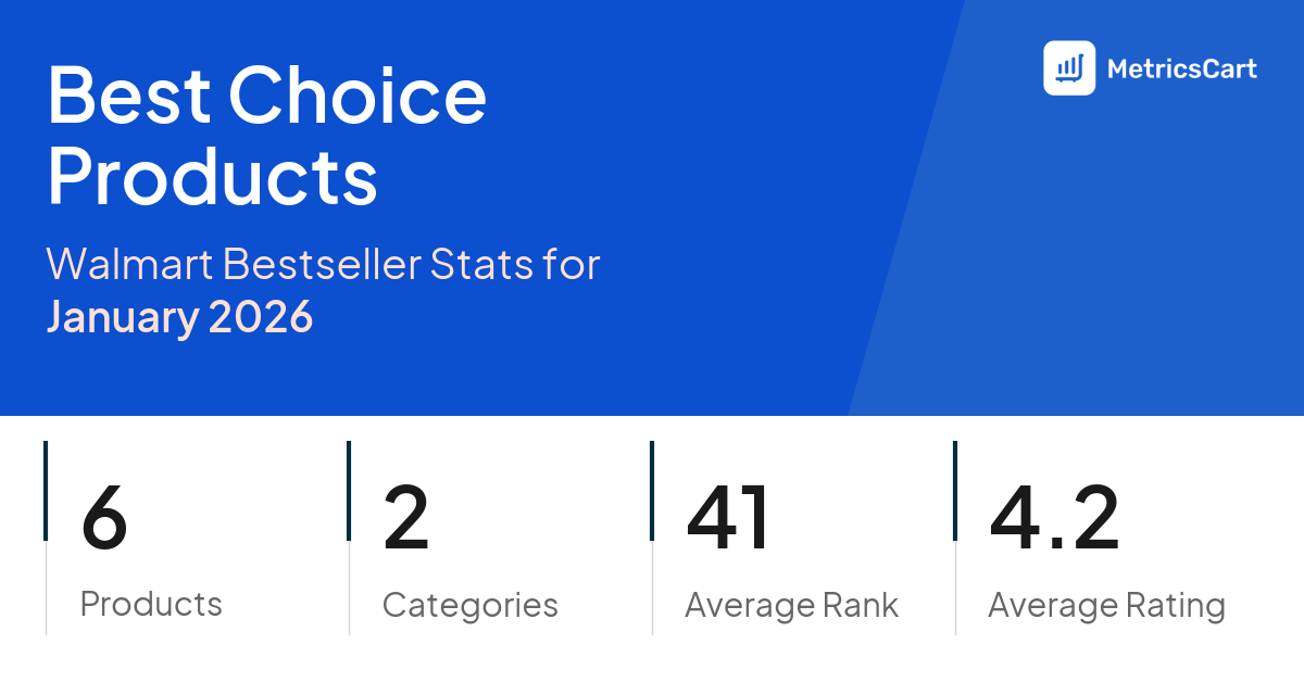 In January 2026, Best Choice Products appeared on Walmart's bestseller lists with 6 unique products across 2 categories. These products appeared in categories including Sports & Outdoors and Toys. The brand's products on the bestseller lists were priced between $14.99 and $189.99, with an average price of $36.11. These bestselling products maintained an average rating of 4.2 based on 6K total ratings from customers who purchased products that appeared on the bestseller lists.